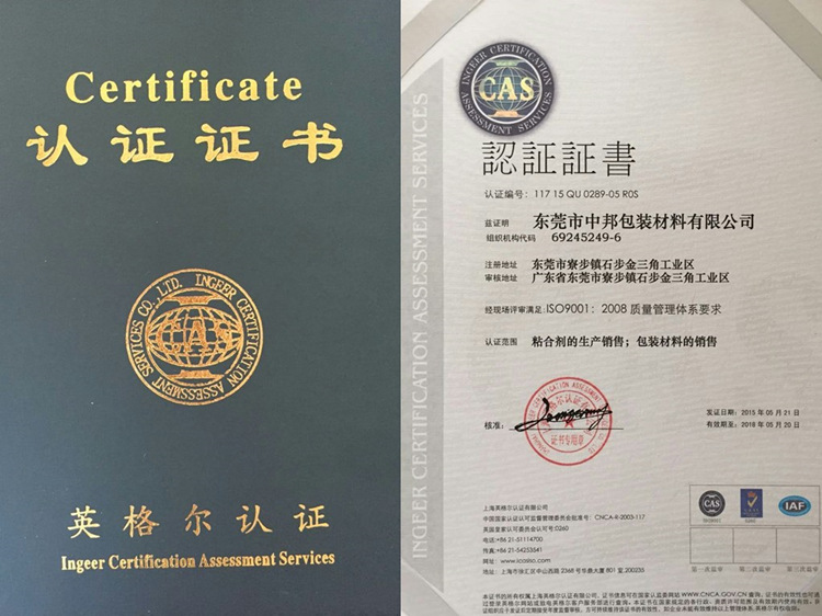 东莞市中邦包装材料有限公司所生产的骨胶通过SGS欧盟认证、MSDS认证,公司拥有庞大的销售及售后服务团队,销售遍及北京、浙江、广东、上海、山东、福建等国内各大城市。